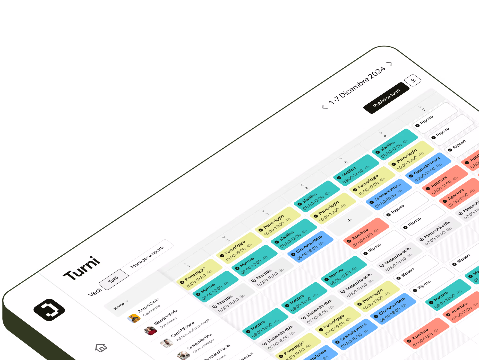 Con il nostro software gestione turni puoi definire orari, turni e rotazioni, tenere traccia delle assenze e gestire lavoro intermittente. Visualizza tutto in un unico calendario, calcola straordinari, evita sovrapposizioni e tieni sotto controllo i costi orari.